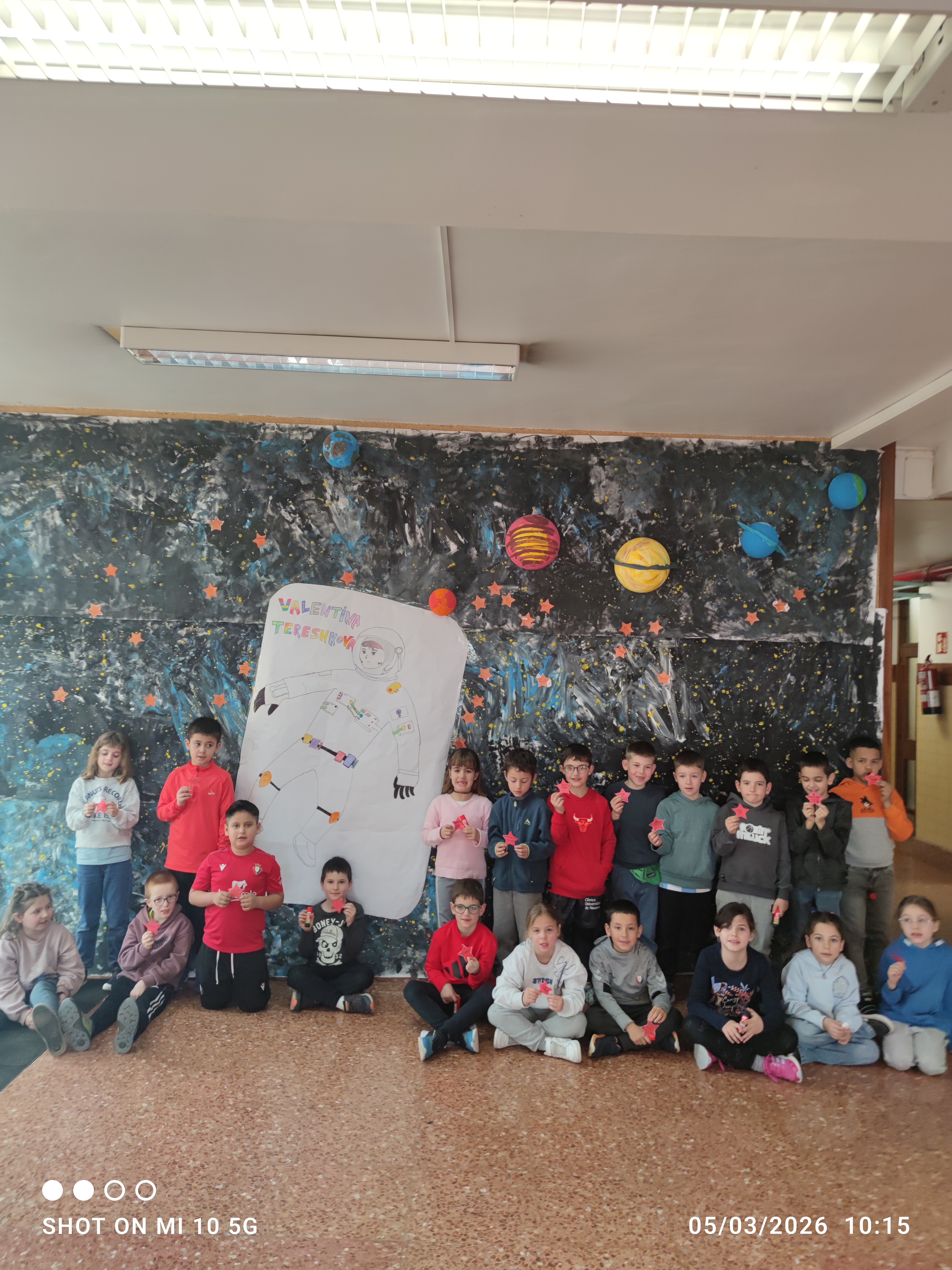 Alaitzen Valentina Tereshkova emakume zientzialaria landu dugu. Espazioari buruzko horma-irudi bat sortu dugu ikasle guztien artean, izarrak jarriz eta izar bakoitzean ikasleentzat beren bizitzan esanguratsuak diren emakumeen izenak idatziz.